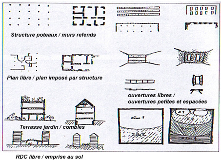 pilotis / toit terrasse aménagé / structure poteaux / mur rideau / fenêtre en longueur